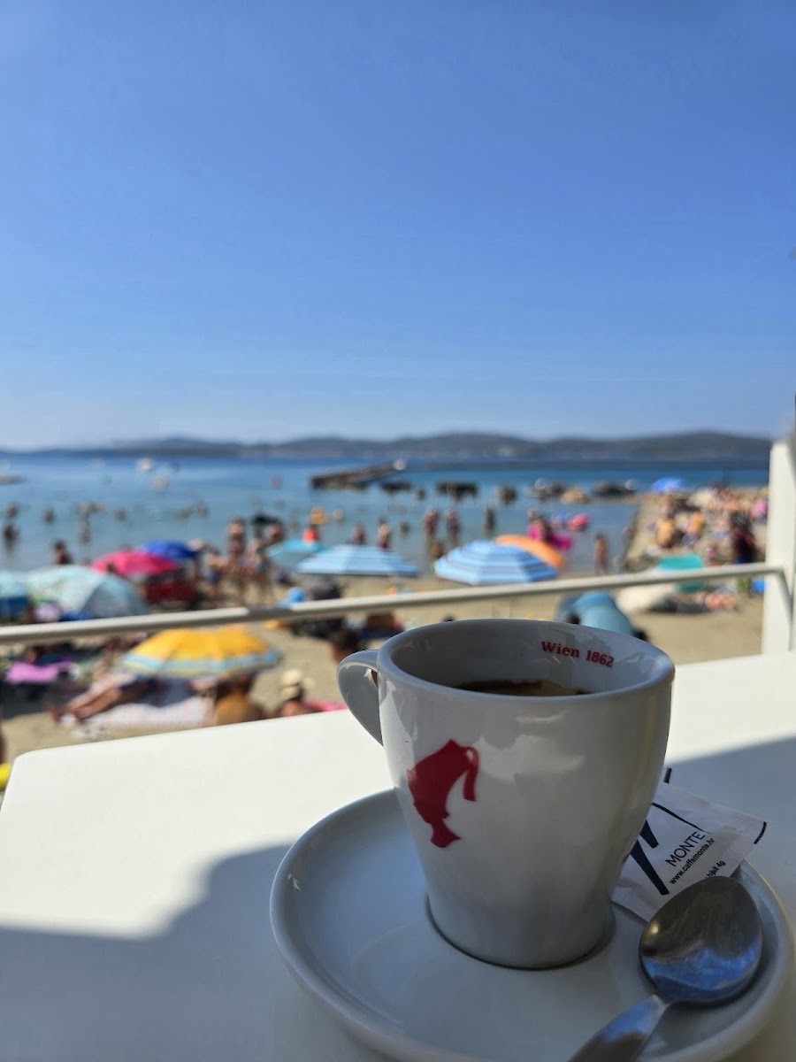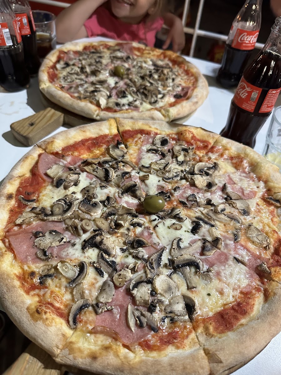 Za one koji vole pizze s malo više nadjeva i "malo jače" ovo je dobra lokacija, postoje i morska jela, girice izgledaju primamljivo. Odmah uz plažu, pogled na more, a postoji mala uska terasa uz kamenu kućicu sa jakim hladom čak i u podne na +35 ovdje je ugodnig 27 ;). Cijene jako pristupačne jer od jedne normalne pizze dvoje normalne osobe se može jako dobro najesti. Pizza capricozza dva velika piva i kava 17€ što je jako jako povoljno. Jedino zašto je usluga 4 a ne 5 zvjezdica je to što smo pivo i cugu dobili kasnije nakon što je stigla pizza (uslikano) ali nema previše zamjerki jer konovarica je malo neiskusna ali ima šarma tako da je ukupna ocjena 5 od 5 :)